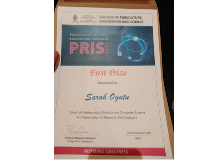 Sarah Ogutu was awarded first place for the oral presentation in the School of Mathematics, Statistics and C...
