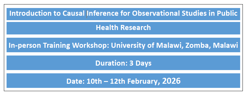 This workshop is designed for public health researchers involved in the design, analysis, and interpretation of results from observational studies. Participants are expected to have basic statistical skills, descriptive statistics, linear and logistic regression, confidence intervals, and hypothesis testing; basic epidemiology, including exposure, outcome, confounding, and bias; and observational study designs such as cohort, case–control, and cross-sectional studies. Some hands-on experience with statistical software (e.g., R, Stata) is required. However, no prior formal training in causal inference, potential outcomes, or directed acyclic graphs (DAGs) is needed, as these will be introduced from first principles.