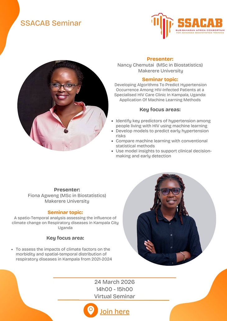 An upcoming SSACAB Biostatistics Research Seminar will feature two speakers from Makerere University presenting research on the intersection of data science, public health, and environmental health. The seminar will cover machine learning approaches to predicting hypertension among people living with HIV and a spatio-temporal analysis examining the influence of climate change on respiratory diseases in Kampala, Uganda.